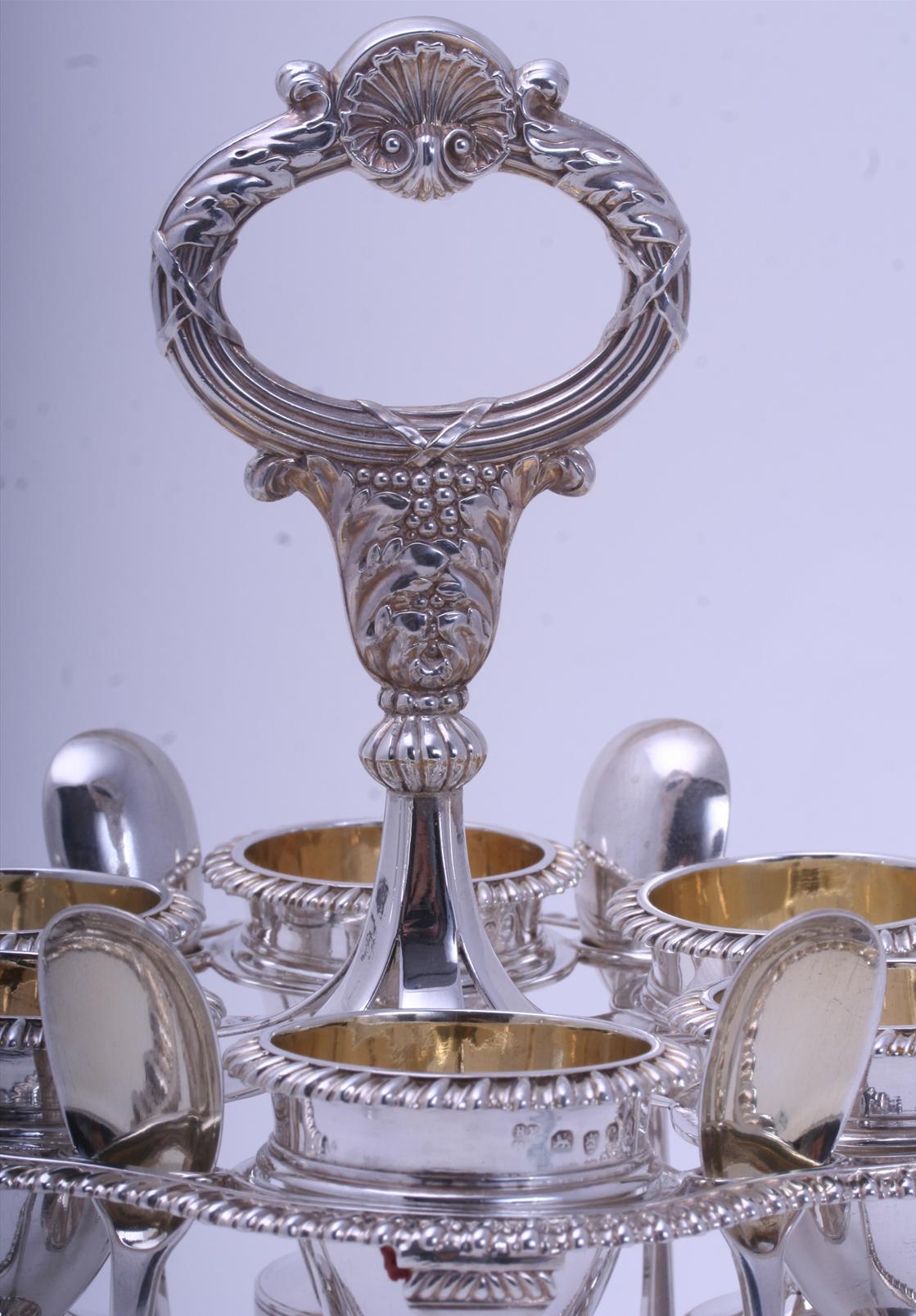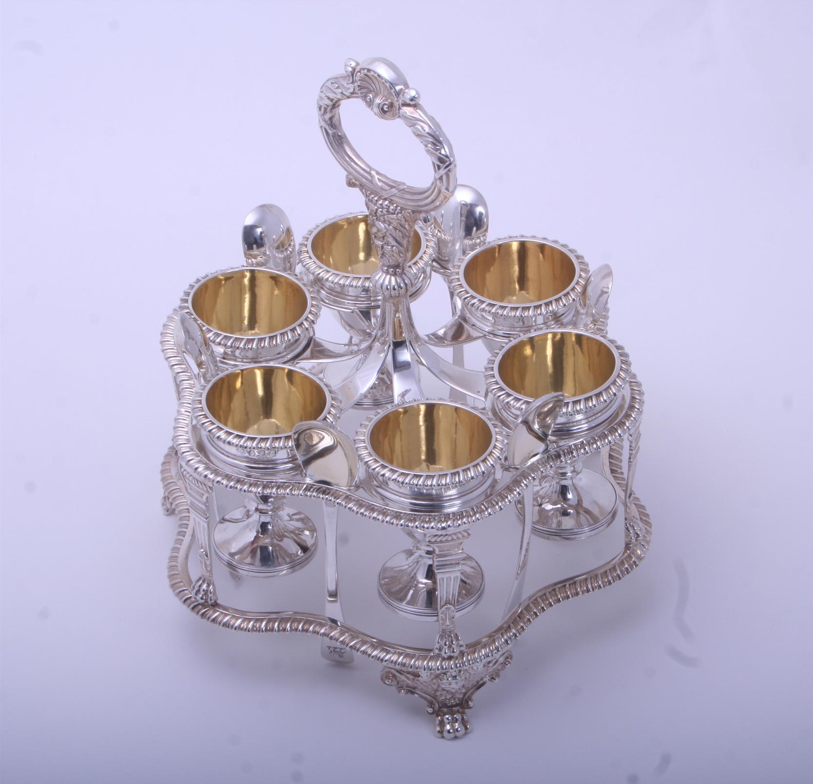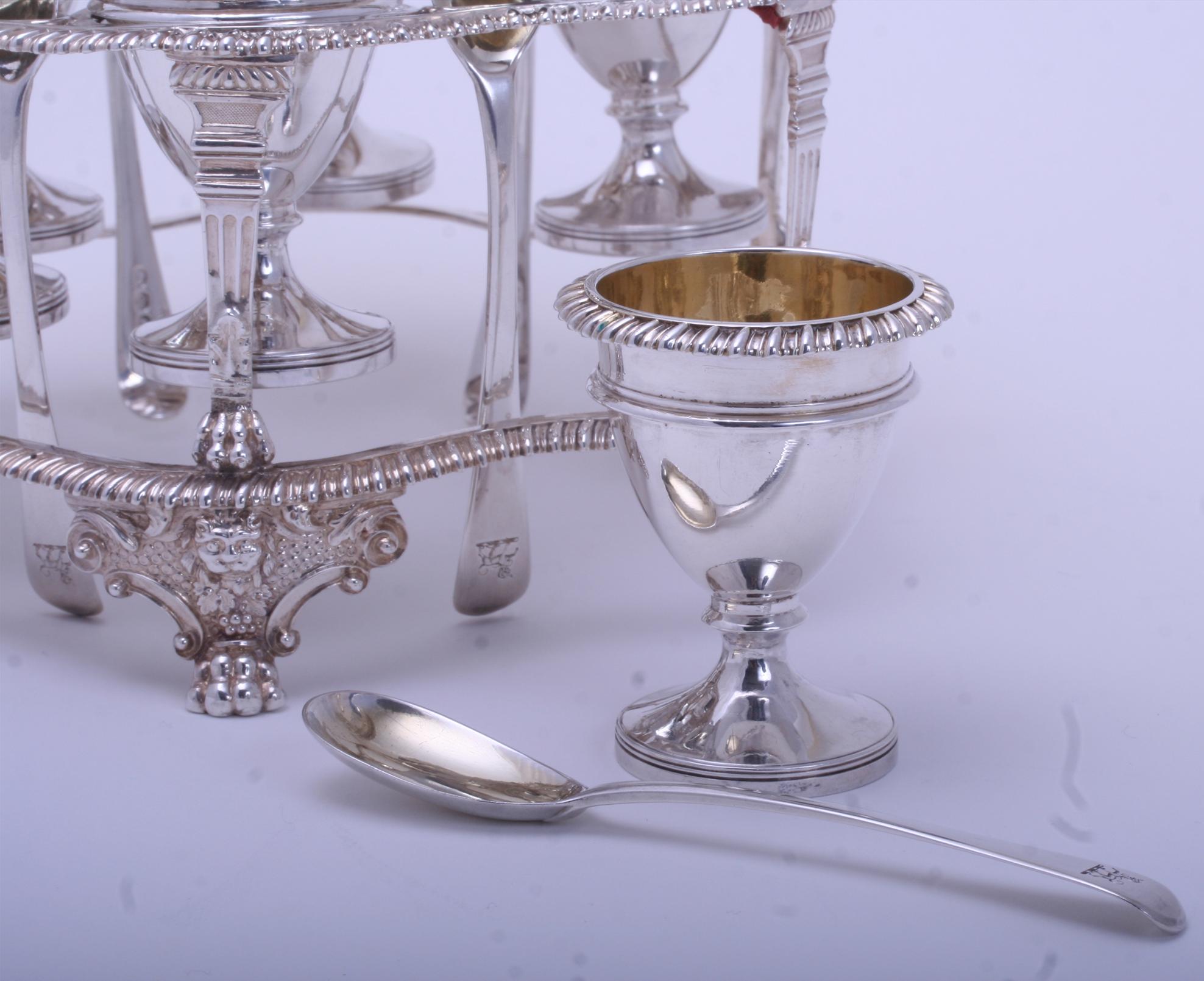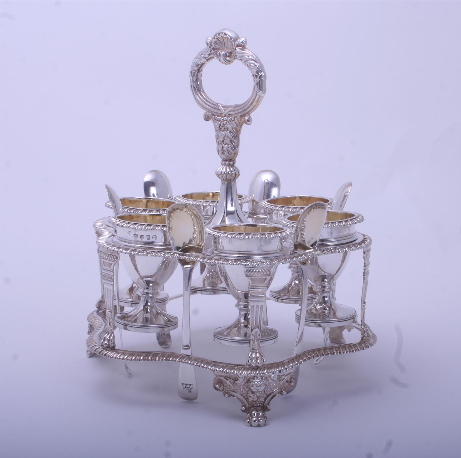 a hexagonal shape egg cruet frame, gadrooned edge, with raised central handle, column supports, on lion mask and paw bracket feet, with six egg cups (London, 1818) and six egg spoons by William Eley & William Fearn, London 1819.