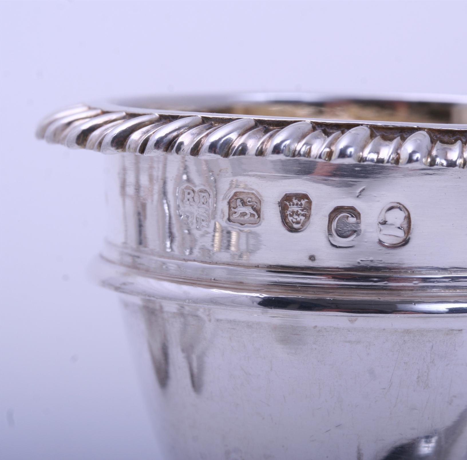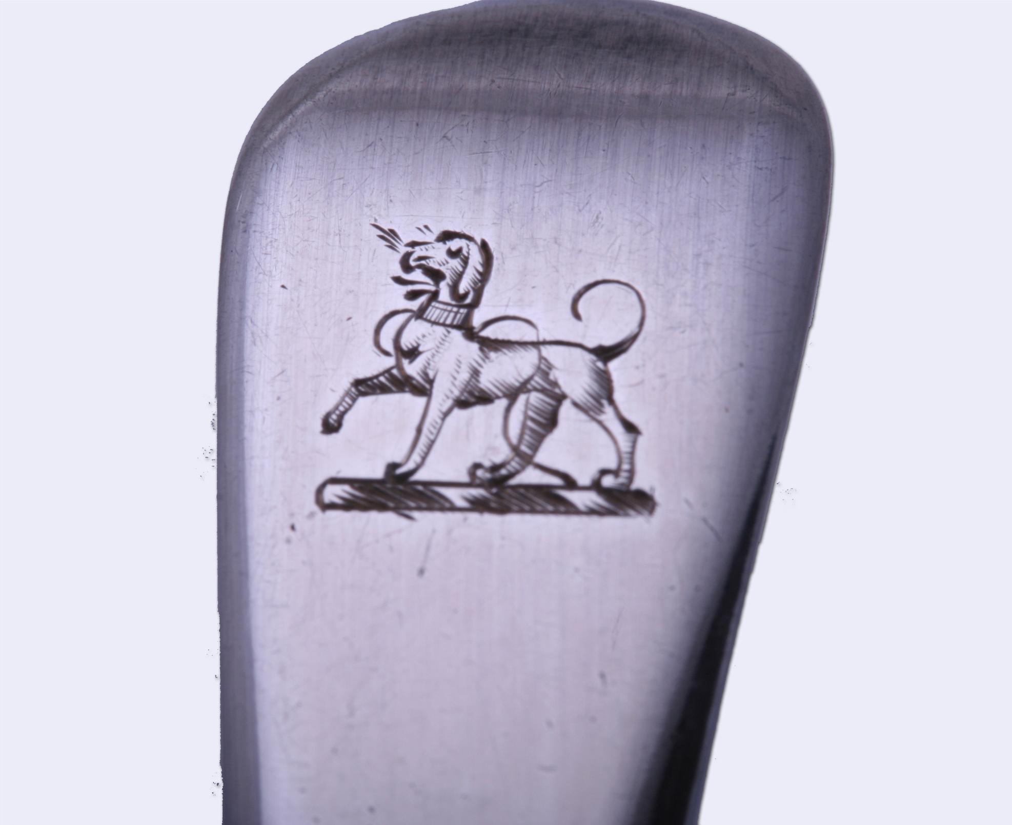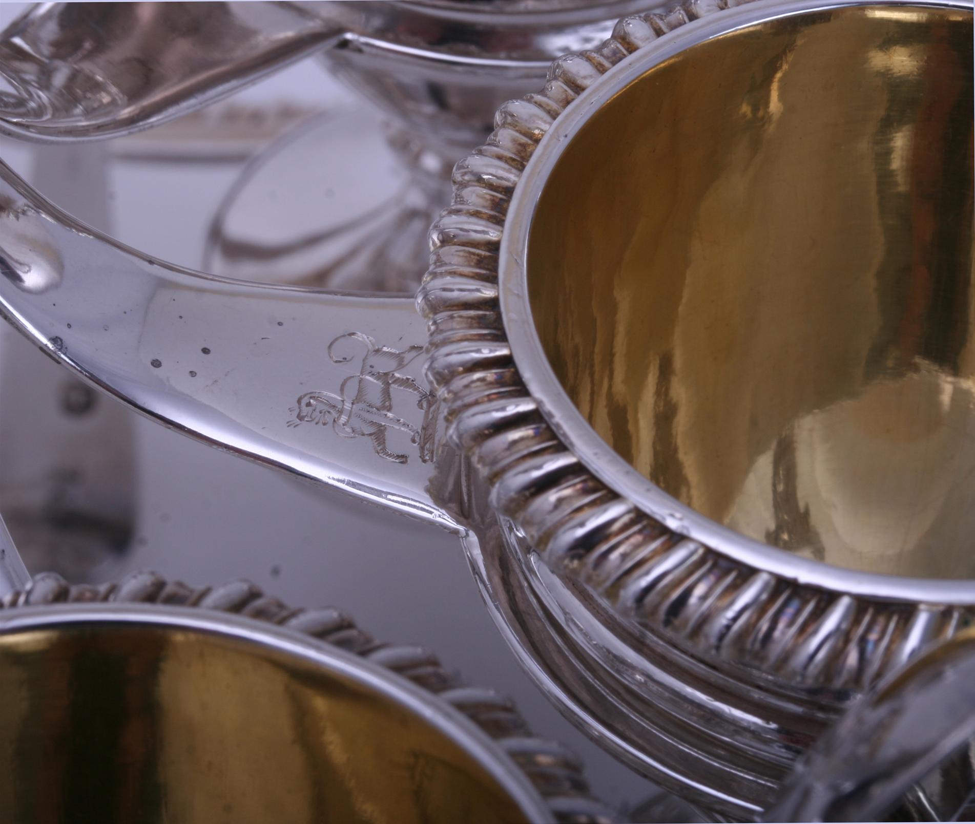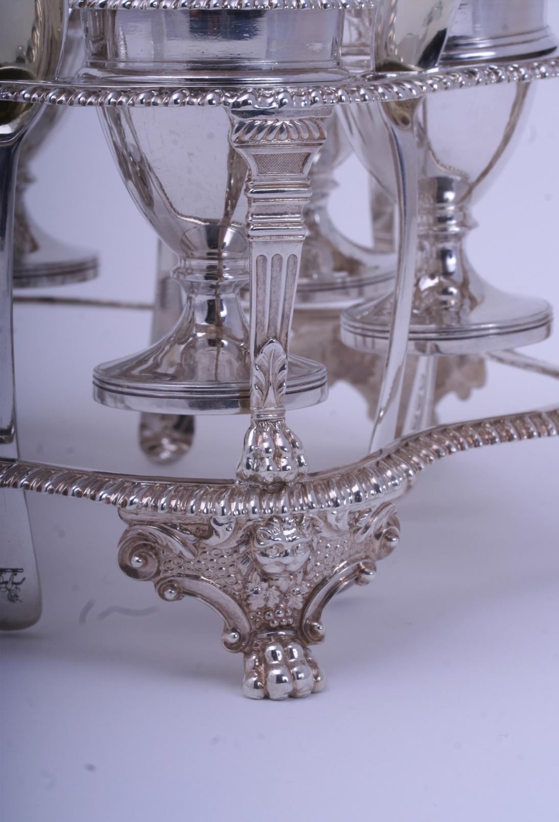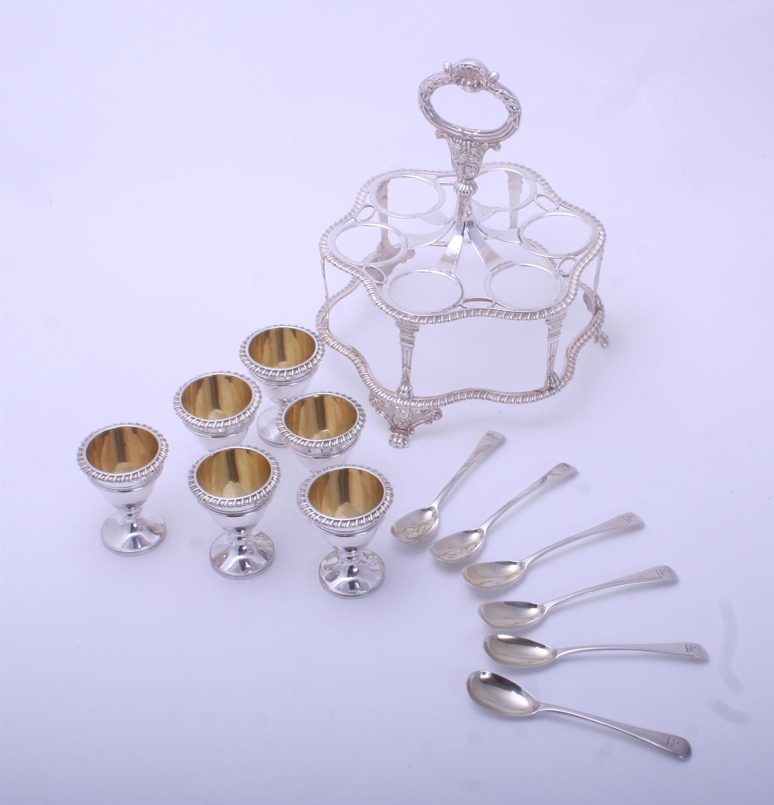 a hexagonal shape egg cruet frame, gadrooned edge, with raised central handle, column supports, on lion mask and paw bracket feet, with six egg cups (London, 1818) and six egg spoons by William Eley & William Fearn, London 1819.