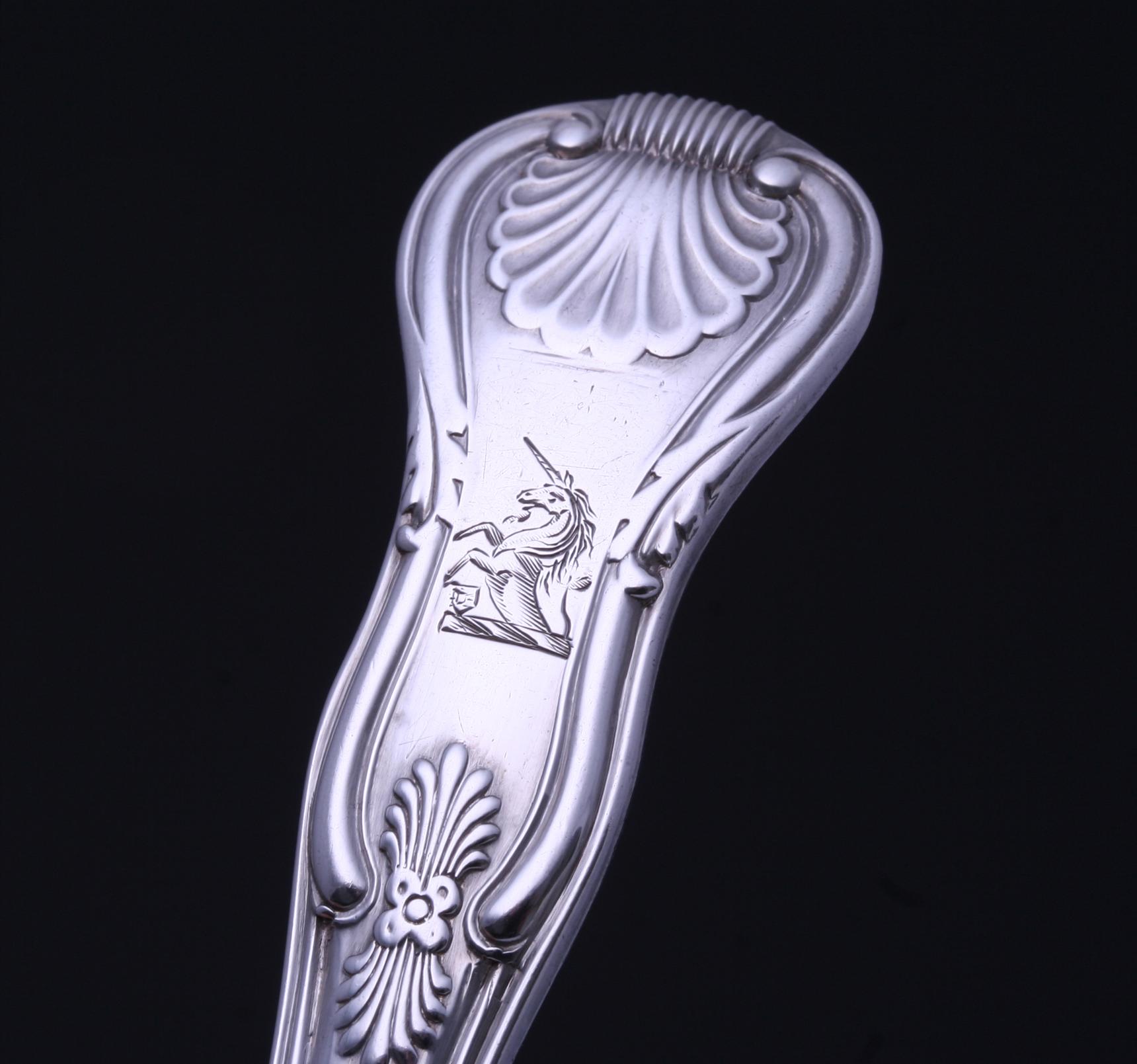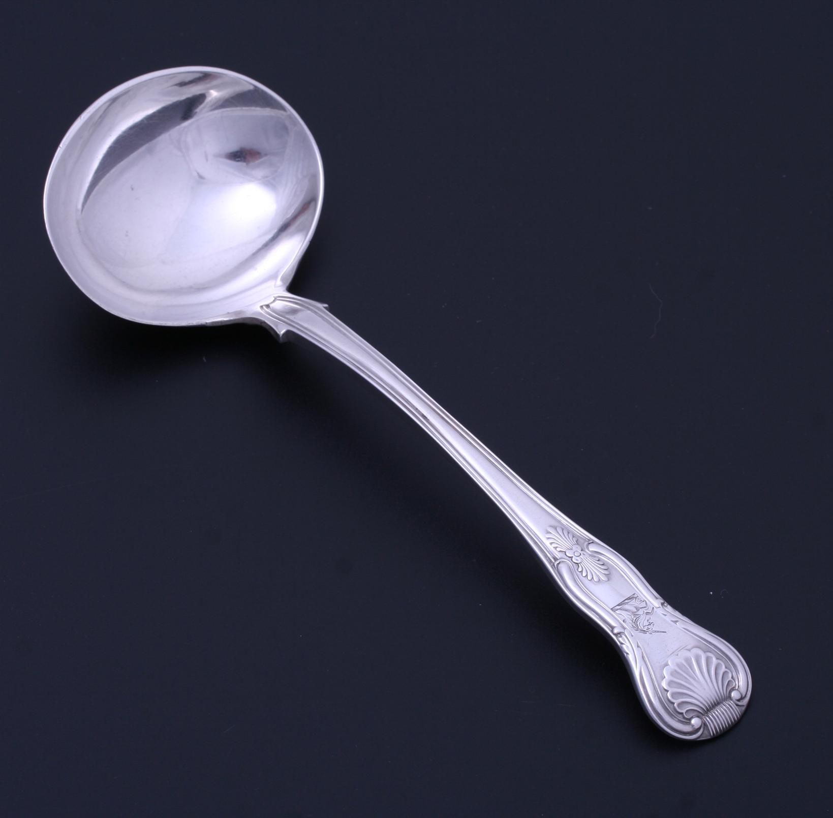 a single struck King's pattern silver sauce ladle engraved with a family crest