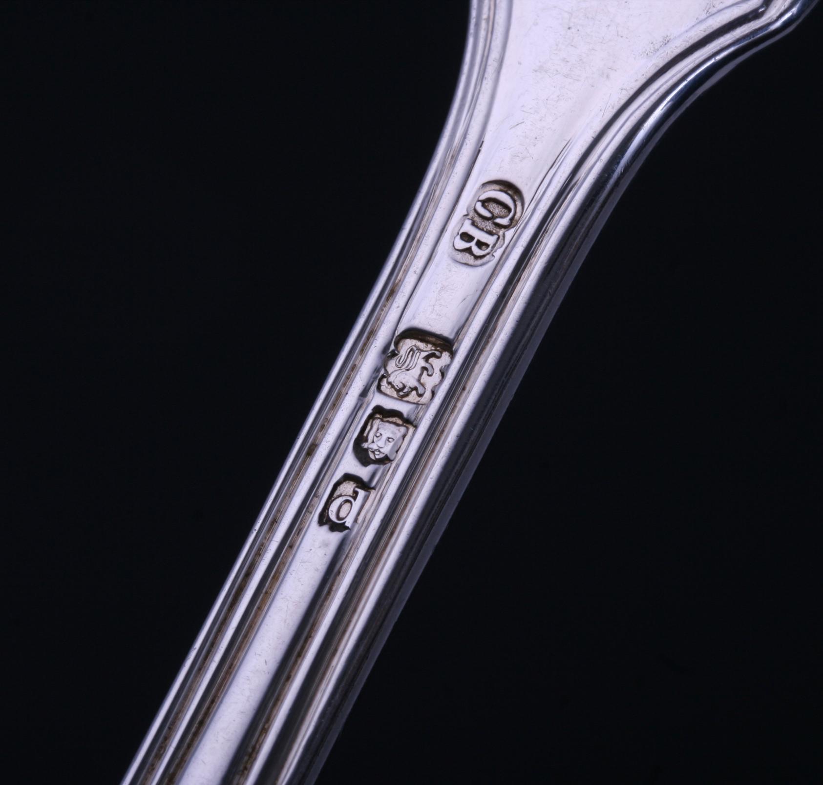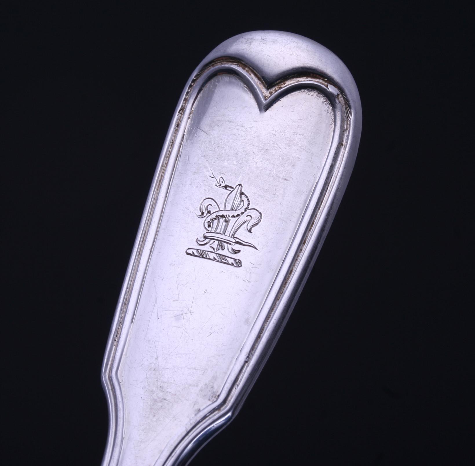 a fiddle and thread pattern silver dessert fork engraved with a family crest