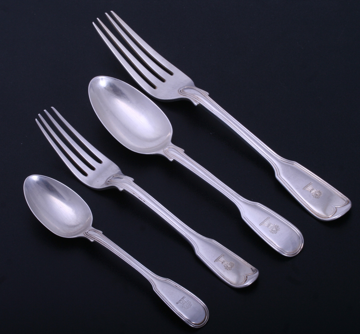 comprising: six fiddle and thread silver table forks (3 x 1816, 1837, 1839, 1852);twelve dessert spooons (3 x 1827,4 x 1842, 2 x 1846, 3 x 1852); nine dessert forks (1831, 1845, 3 x 1852, 4 x 1856)five teaspoons (1832, 4 x 1833)