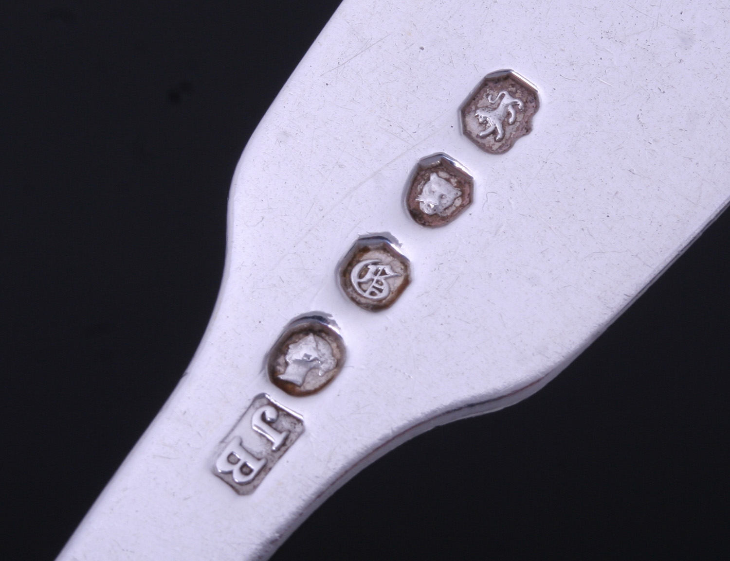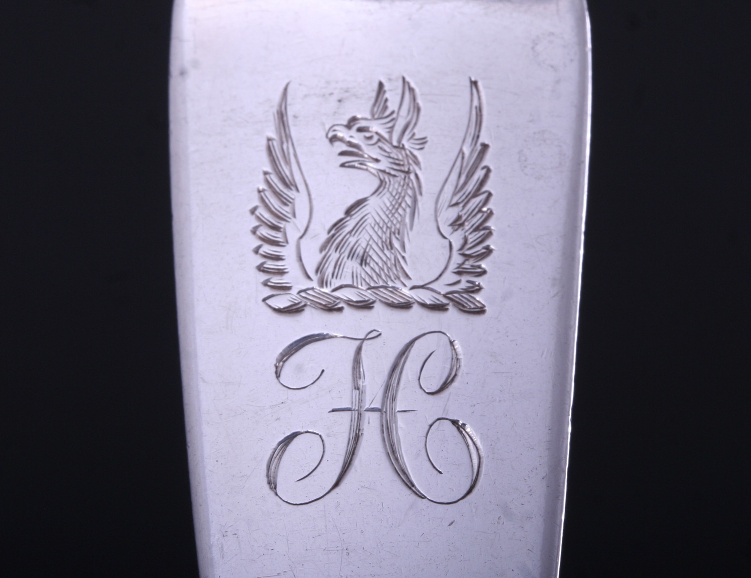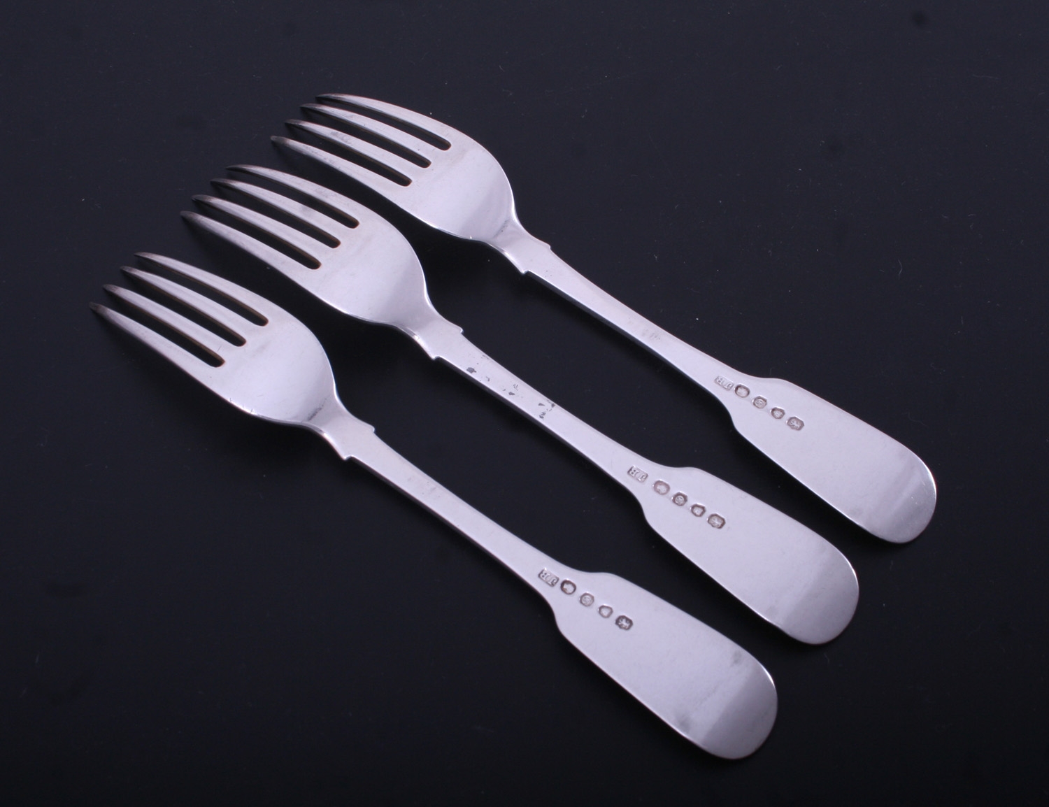a set of three fiddle pattern silver table forks, each engraved with a family crest and initial H.