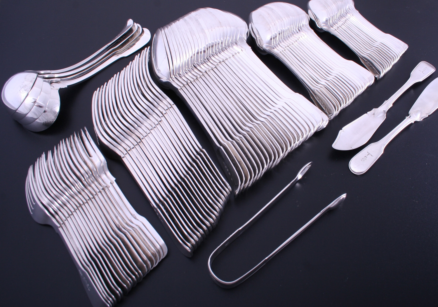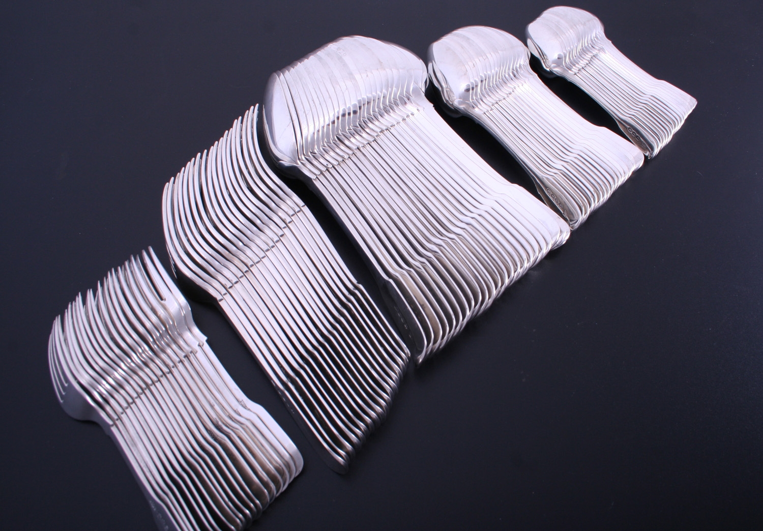 A fine and extensive canteen of single struck fiddle and thread pattern silver cutlery for 18 people comprising:
