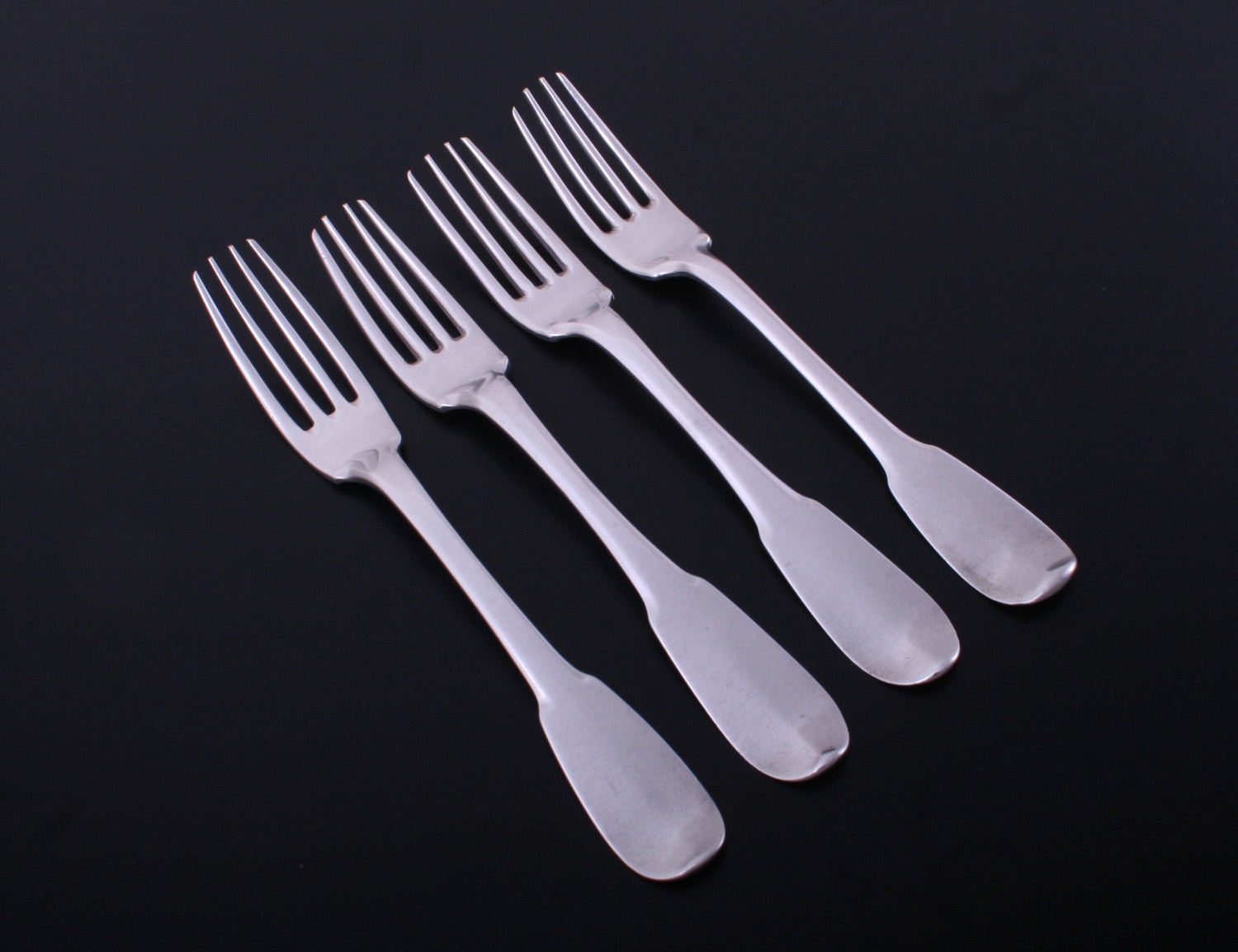 A matched set of four 18th century French provincial fiddle pattern armorial silver table forks