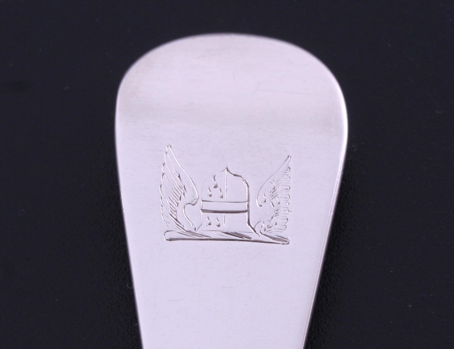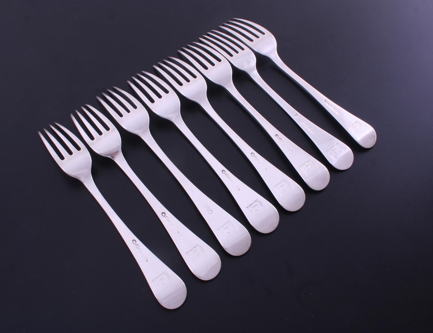 a set of George III single struck Old English with thread pattern silver table forks comprising six by William Eley, William Fearn & William Chawner London 1810; one by William Eley & William Fearn. London 1800 and one by William Eley & William Fearn, London 1804, each engraved with a family crest