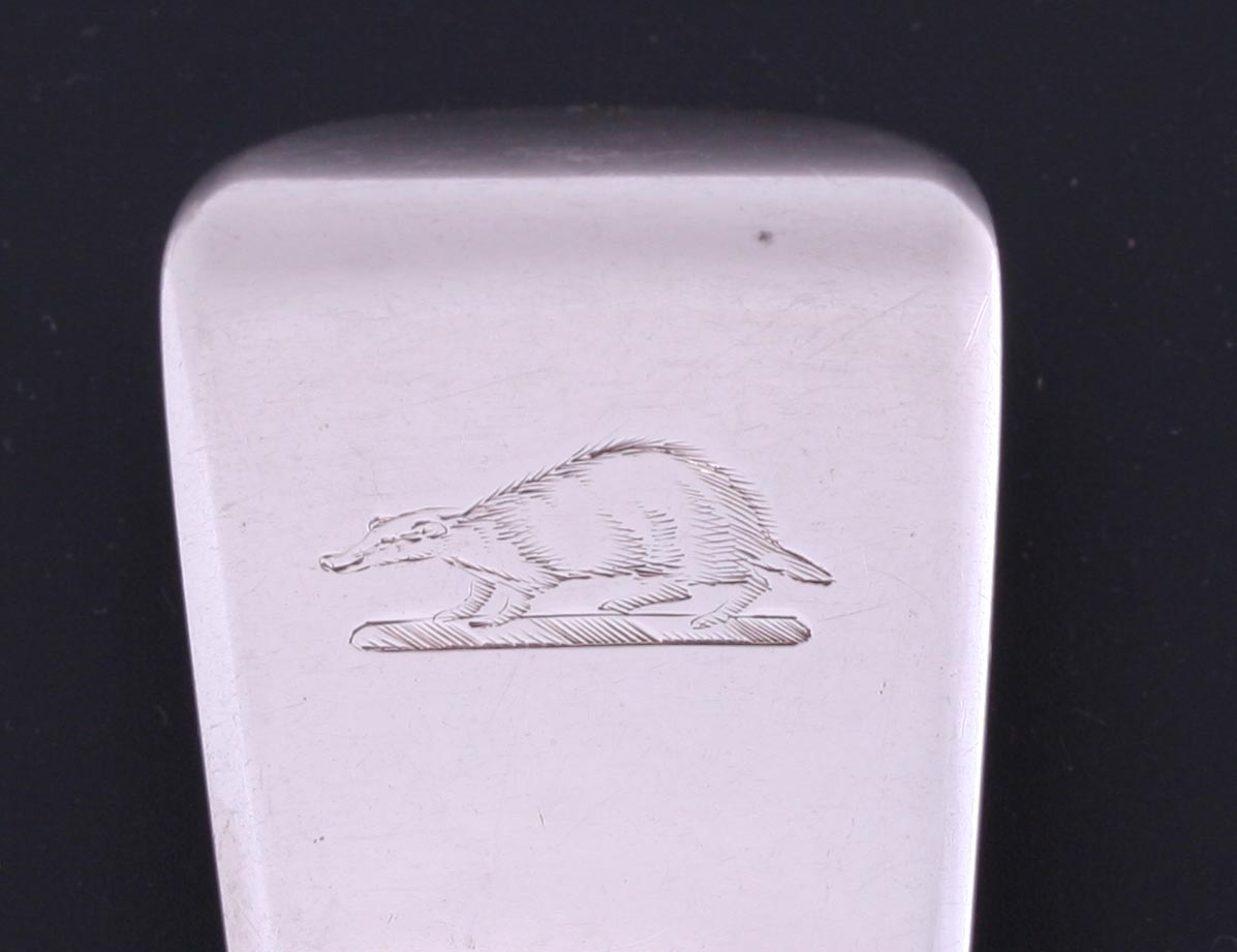 a set of twelve fiddle pattern silver table spoons, each engraved obverse with a family crest