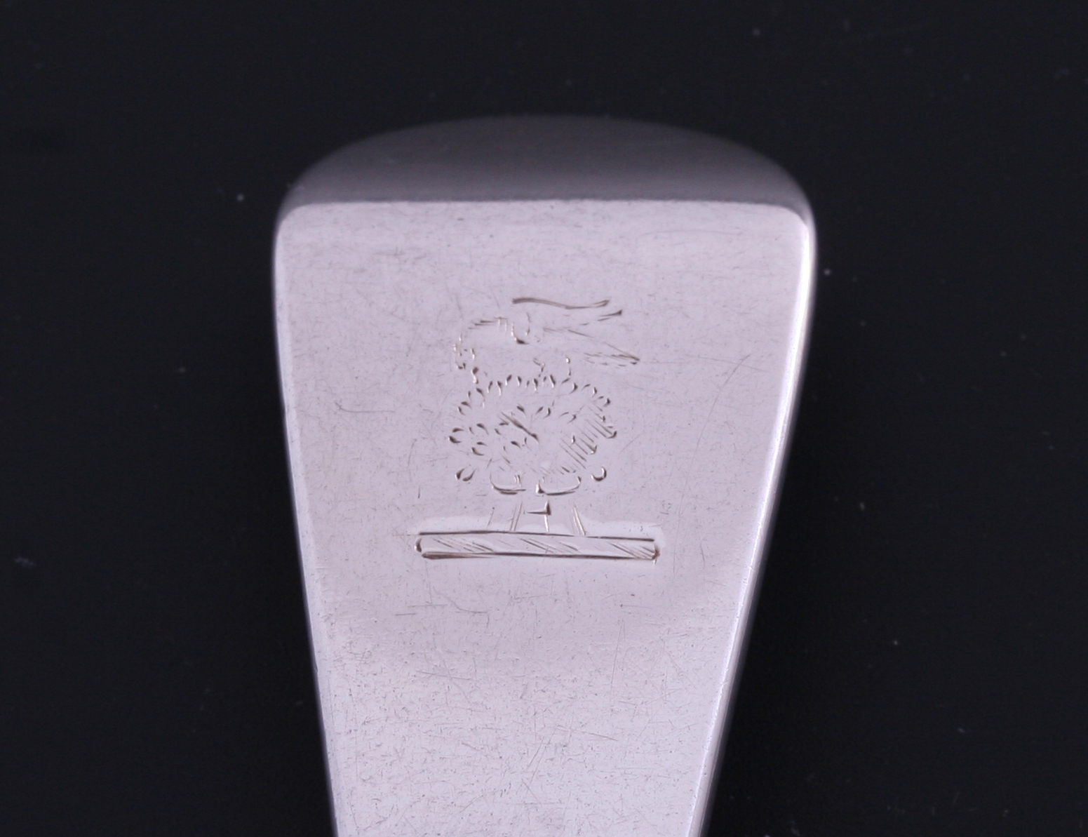a pair of George III Old English pattern sterling silver table spoons, each engraved with a family crest