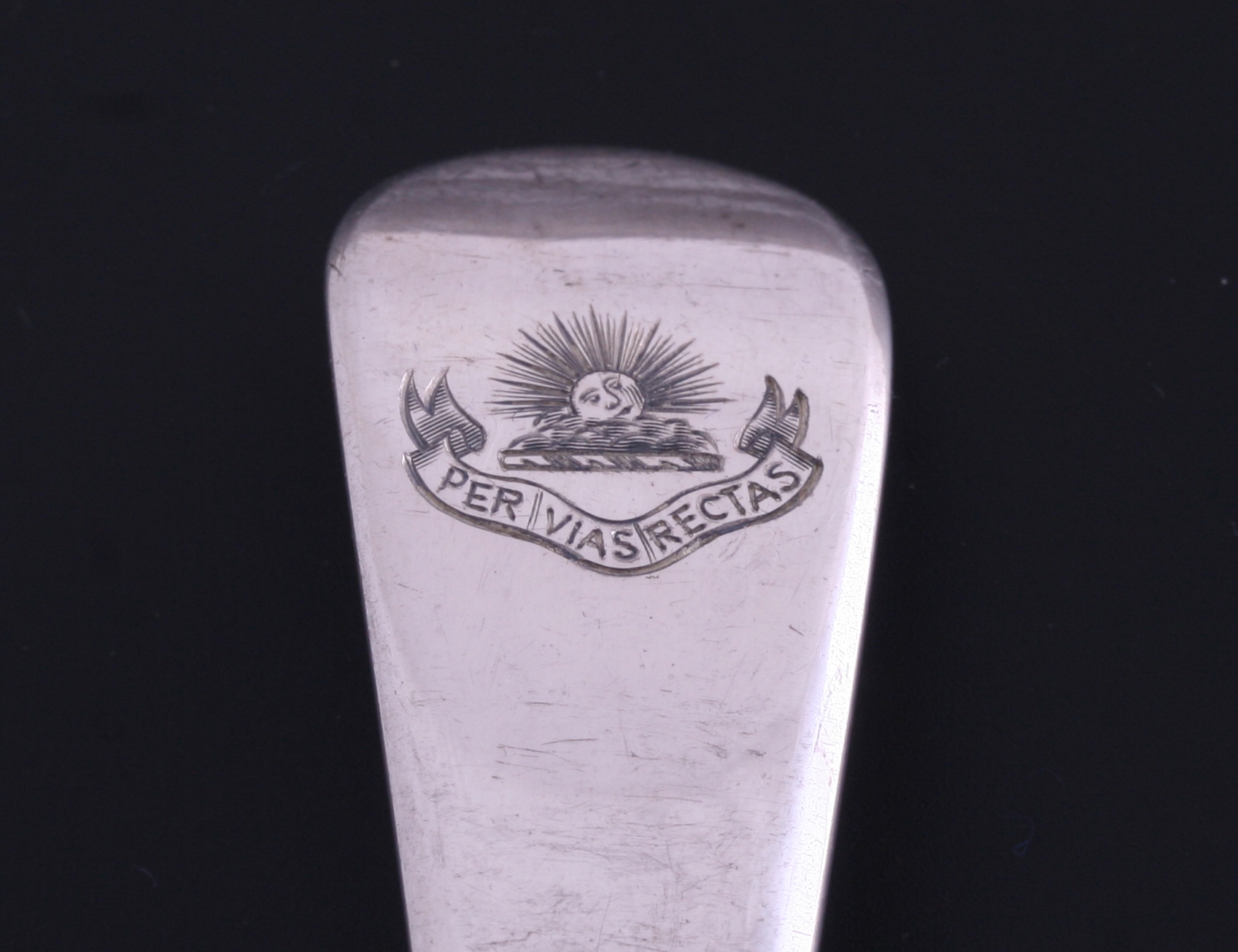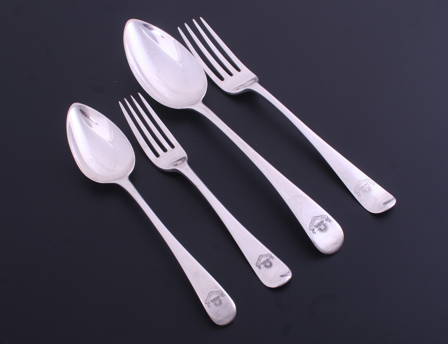 The six table spoons and six dessert spoons London 1804 by the Batemans; five dessert forks London 1805 by Samuel Herbert plus one 1807; three table forksLondon 1804 by Samuel Herbert, two London 1802 by John Blake and one 1799 by Richard Crossley.