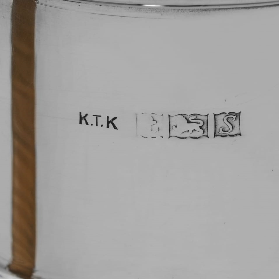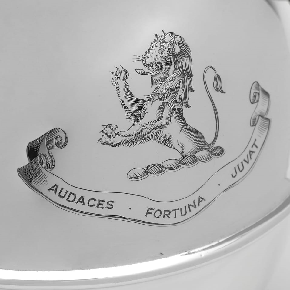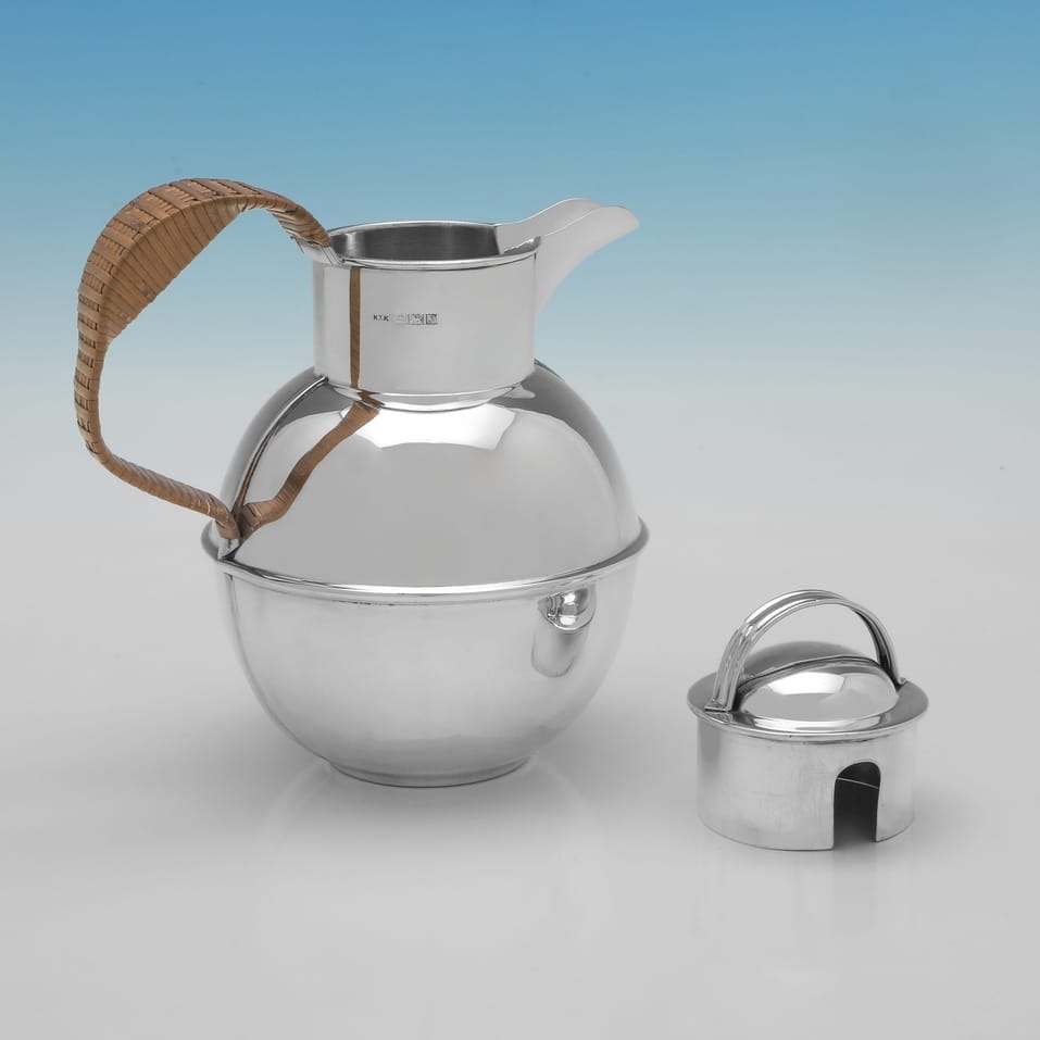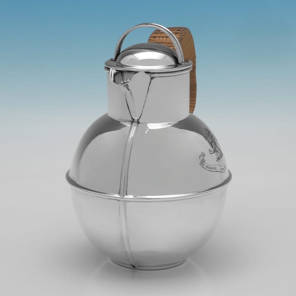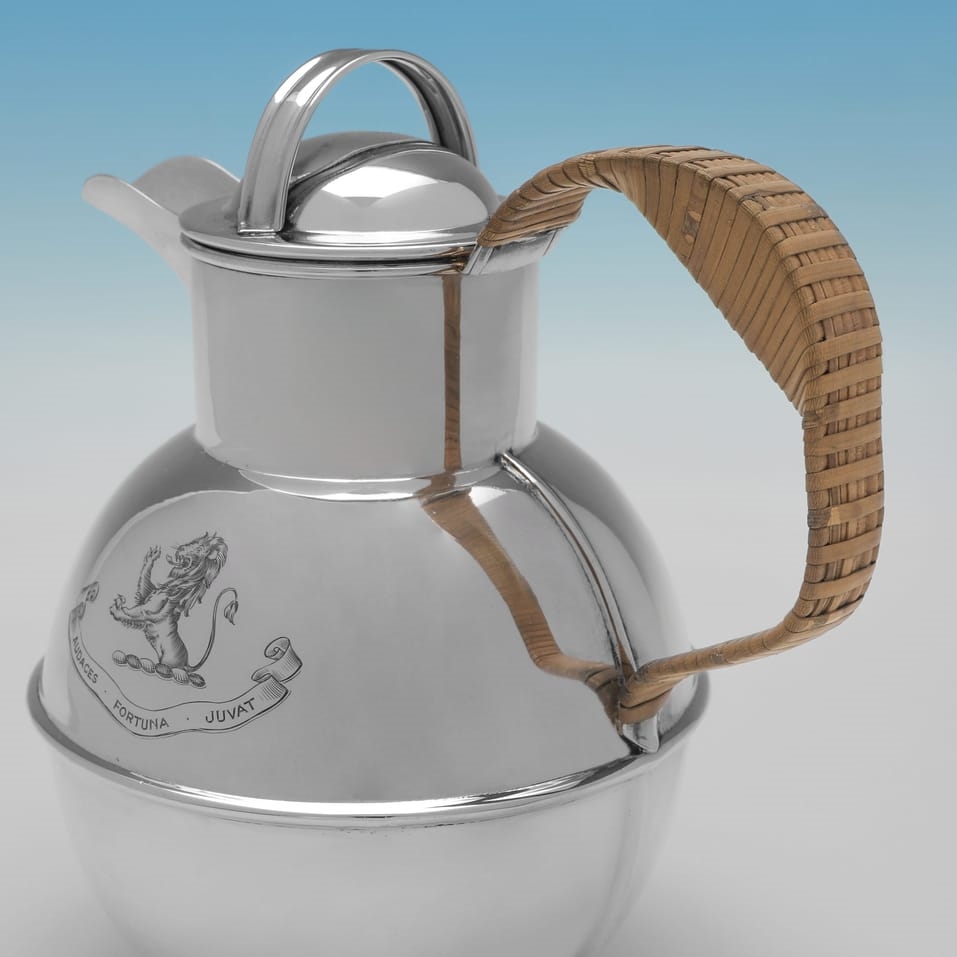 Hallmarked in Birmingham in 1967 by Kenneth Tyler Key this contemporary Elizabeth II sterling silver jug is of the distinctive 'Jersey jug' form. The jug features a globular body, a hinged domed lid with a carrying loop, and a wicker-covered handle. The front of the jug is engraved with a crest of a lion rampant and the motto "Audaces Fortuna Juvat" (Fortune Favours the Brave). It measures 7.5"(19cm) tall by 6.5"(16.5cm) from handle to spout and 4.75"(12cm) deep, and weighs 13.8 troy ounces.