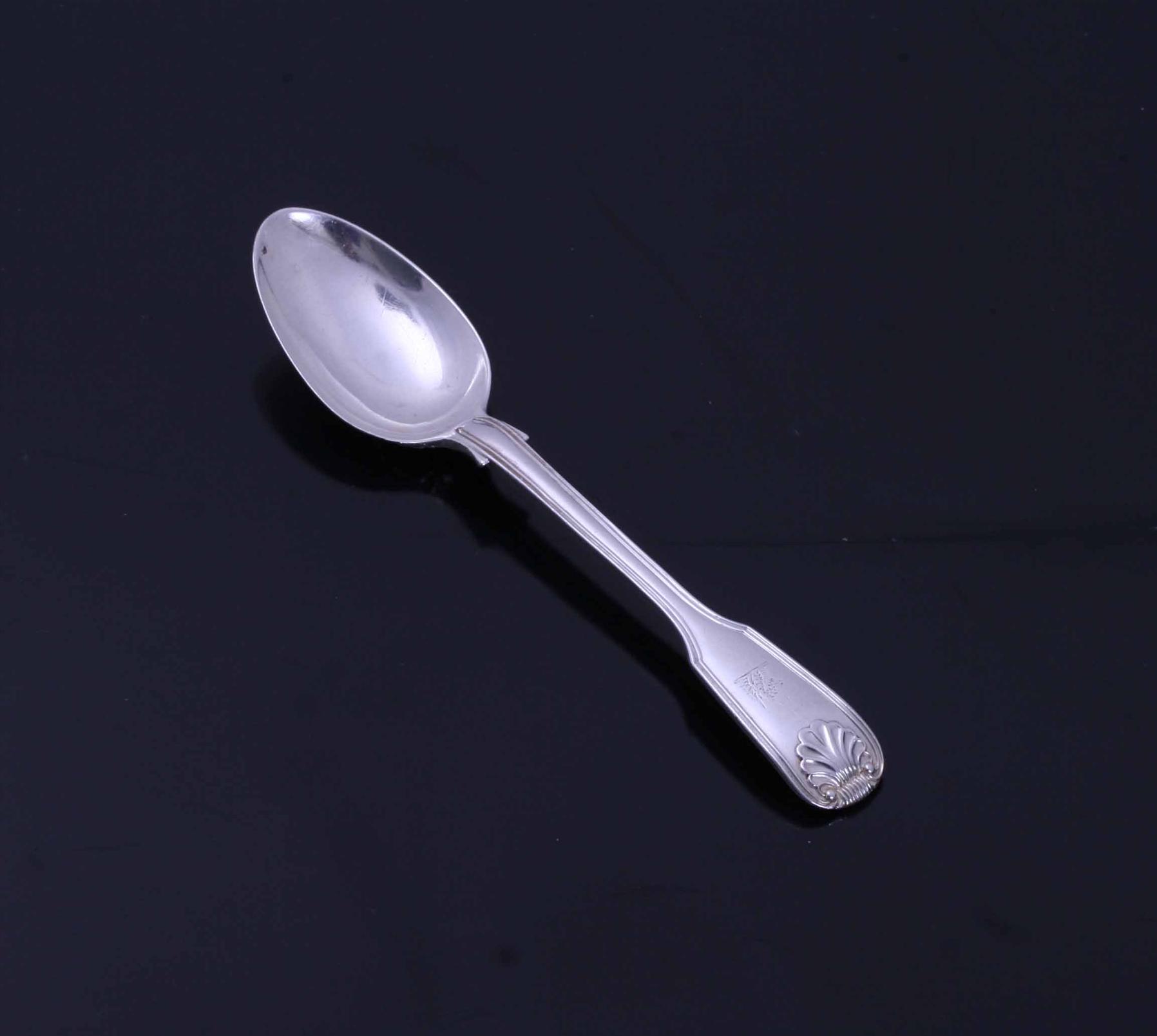 a fiddle, thread and shell silver teaspoon engraved with a family crest (worn)