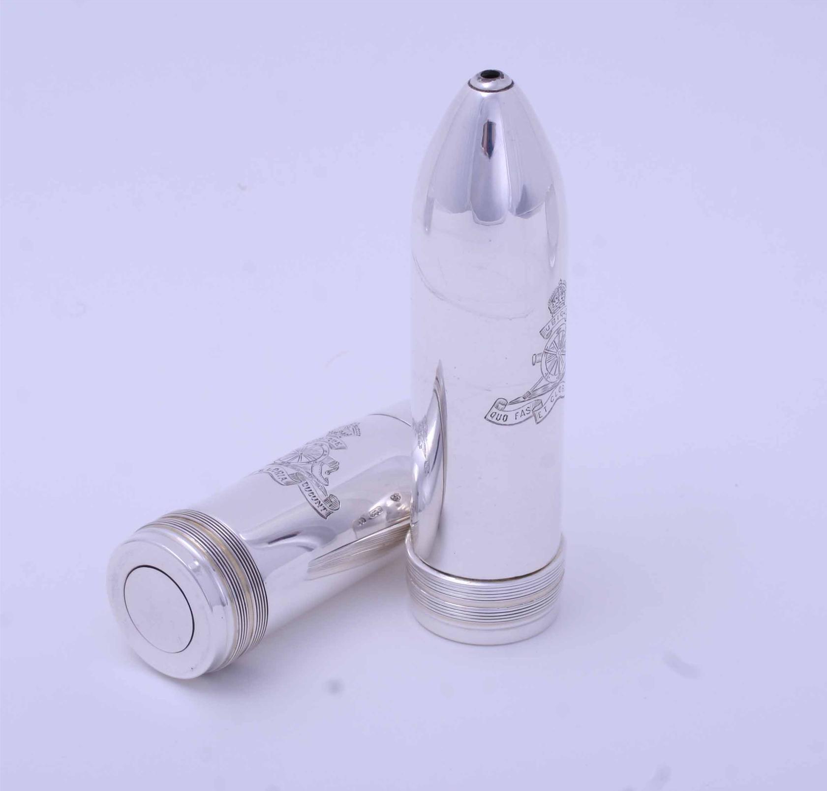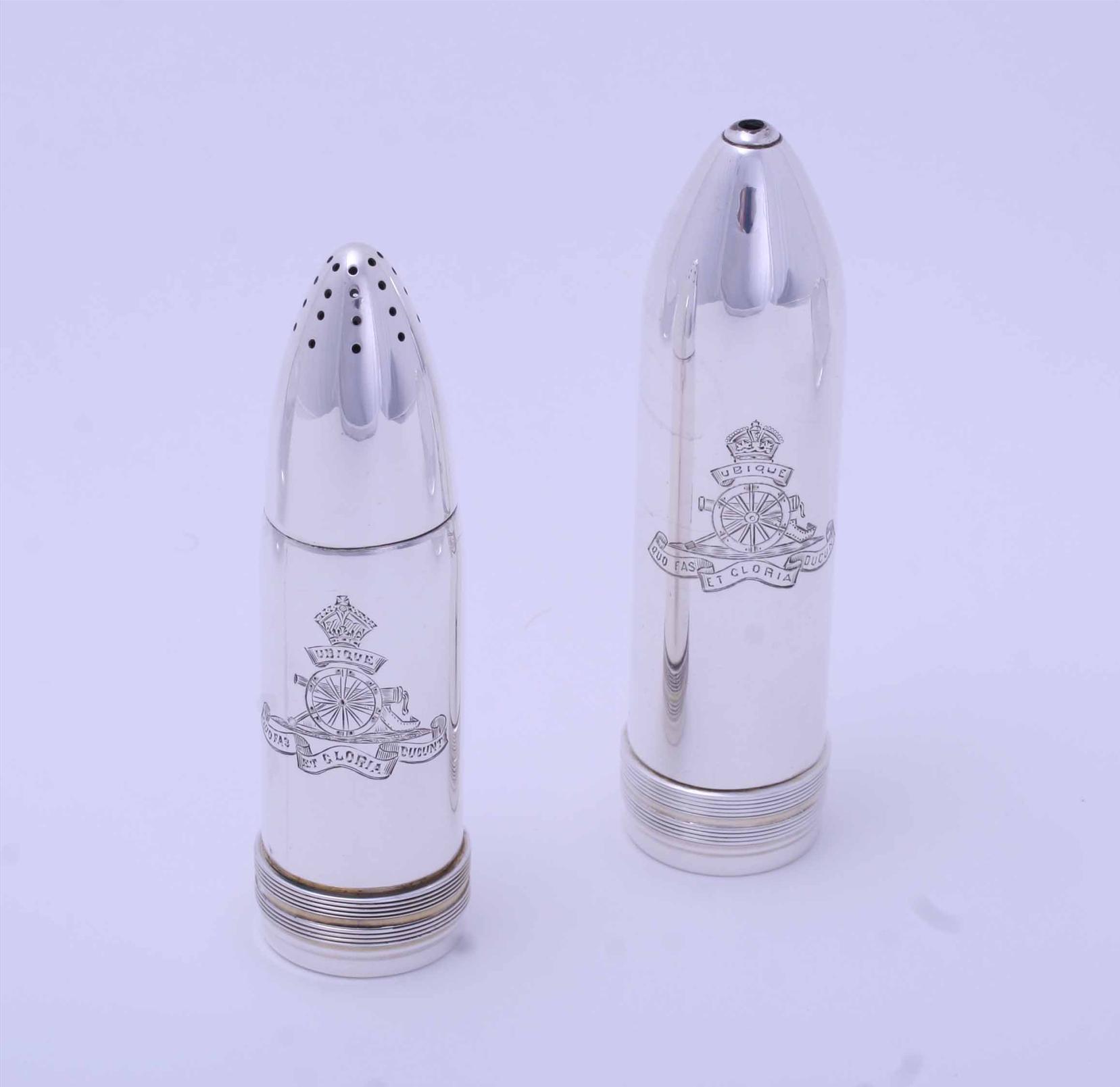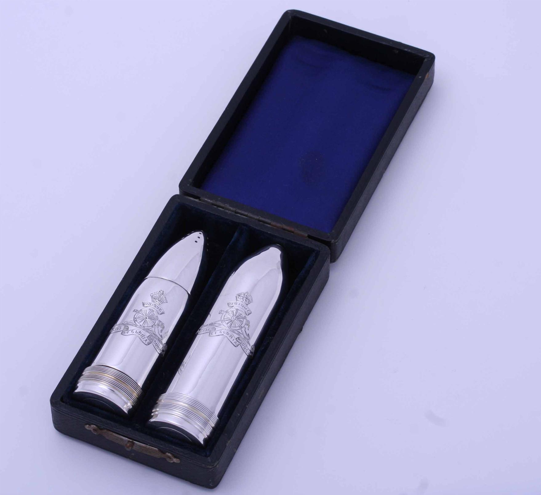 rare condiment set designed as a pair of artillery shells, each engraved with the regimental badge of the Royal Artillery, in original fitted case