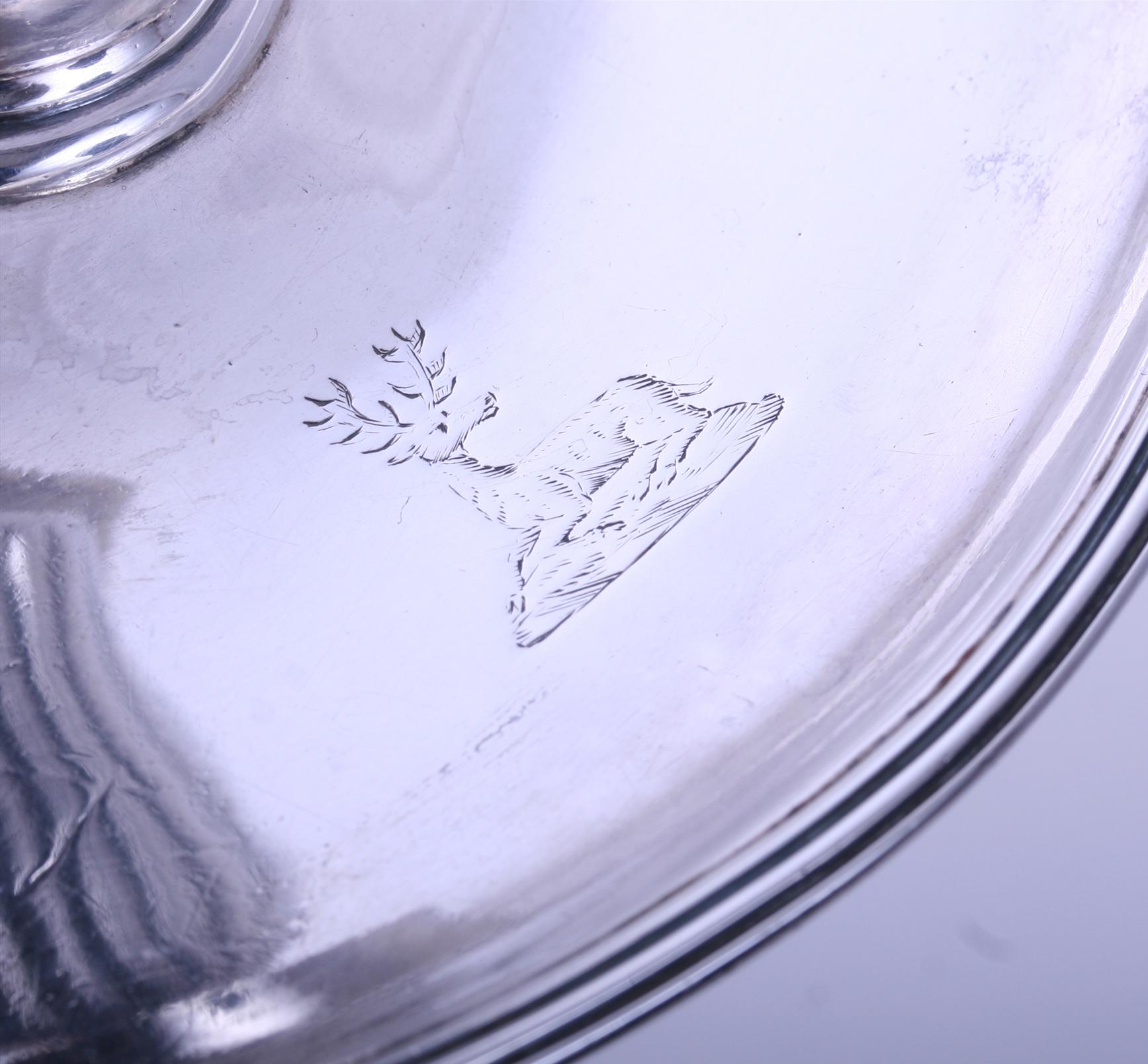 a silver chamberstick oval drip pan with reeded border engraved with a family crest, en suite with modern silver nozzle and extinguisher, London 1973