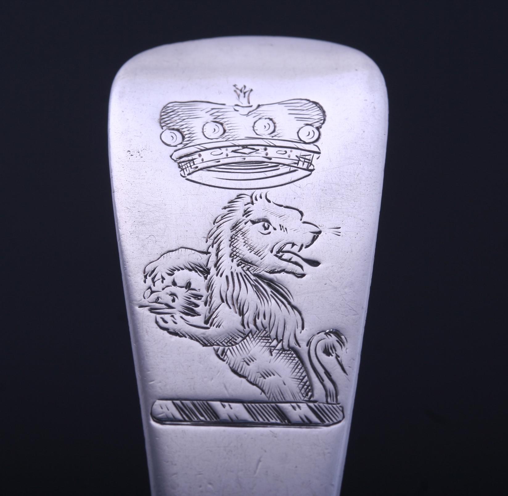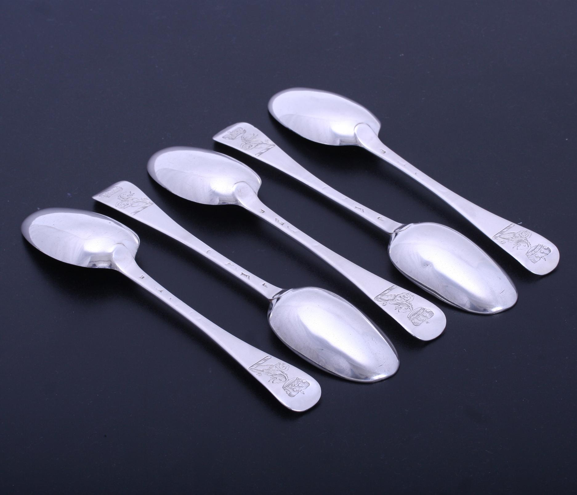 five Irish Hanoverian pattern silver tablespoons, each engraved with a family crest surmounted by a Baron's coronet