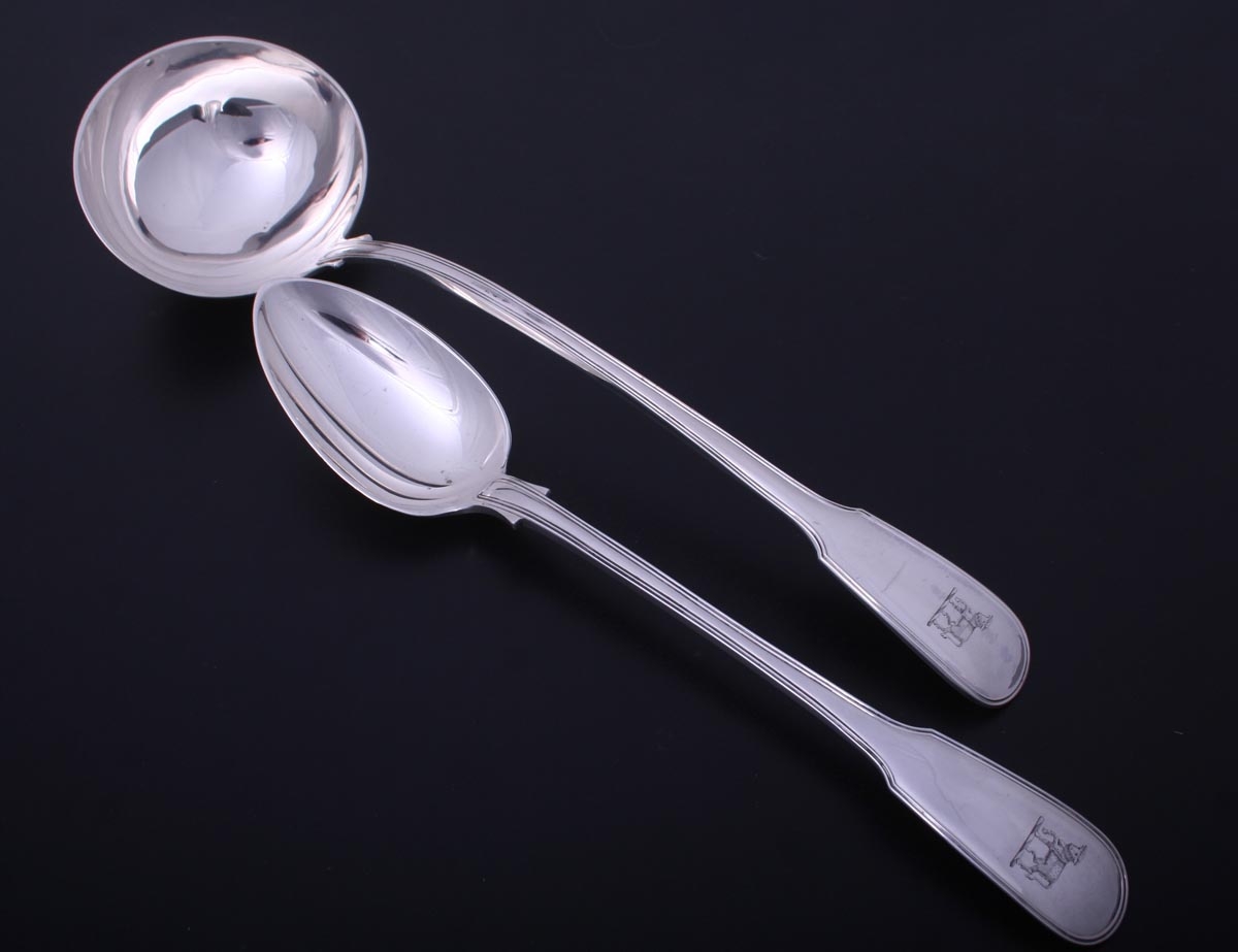 a fiddle and thread pattern basting spoon and soup ladle ensuite, each engraved with a family crest