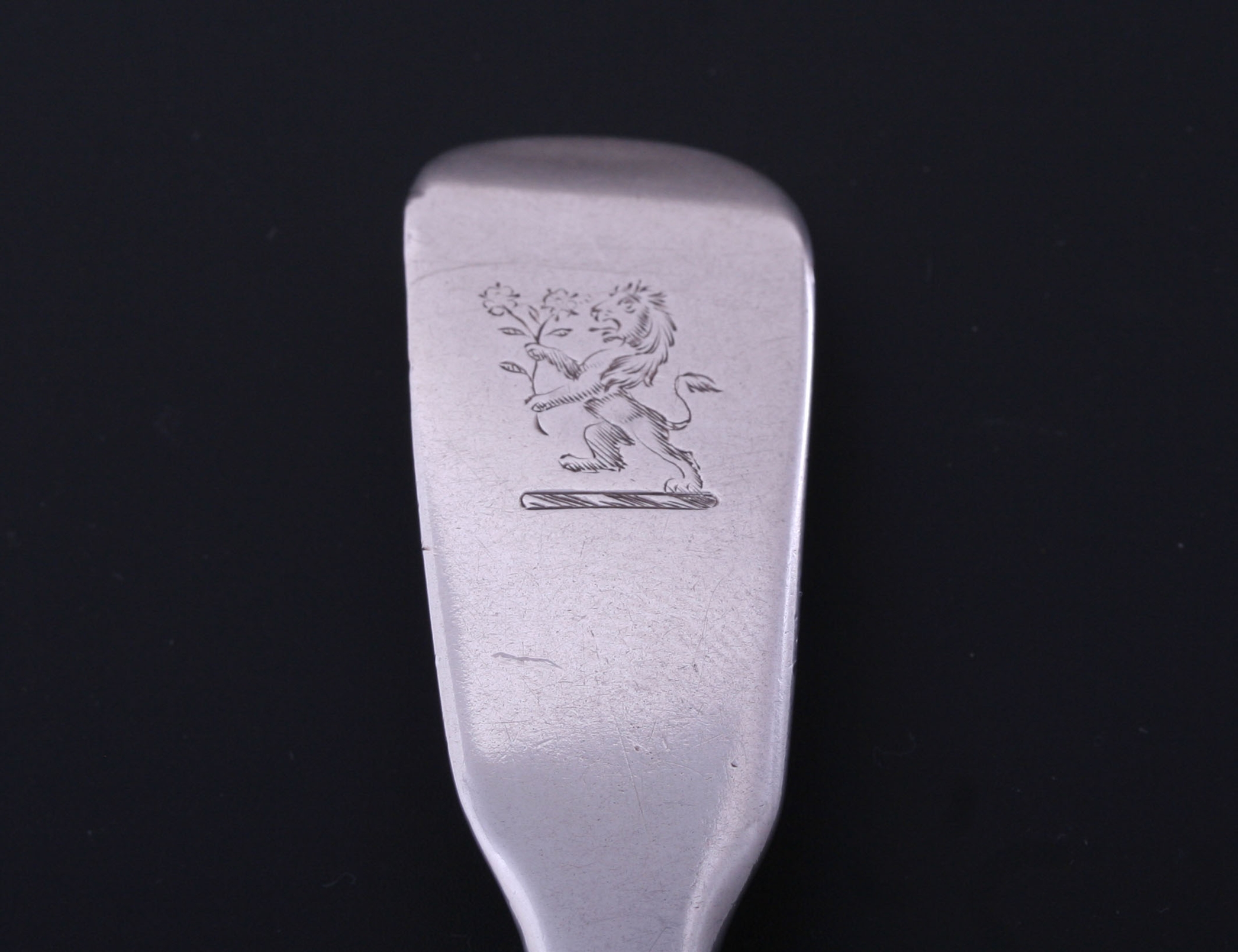 a fiddle pattern silver dessert spoon, engraved with a family crest