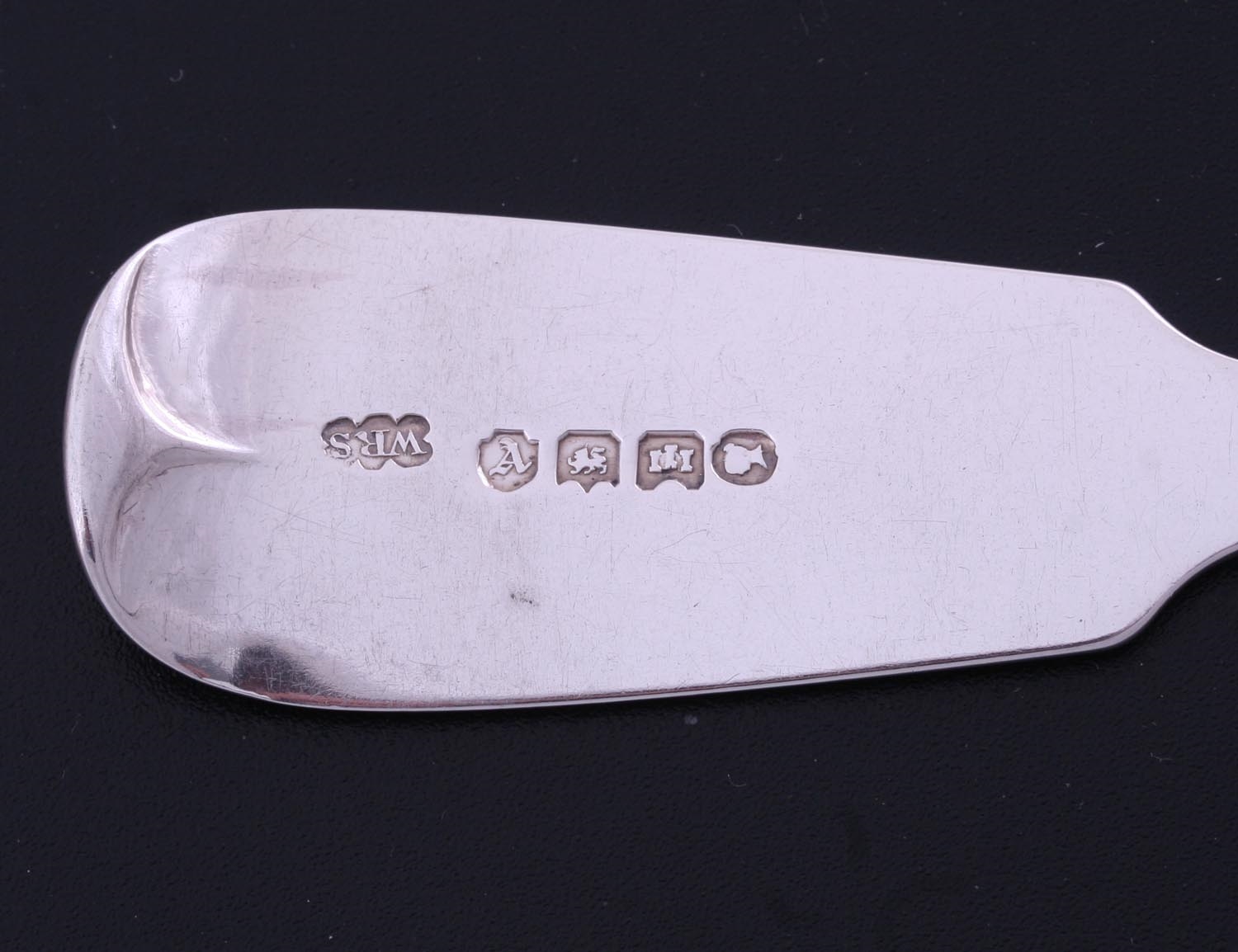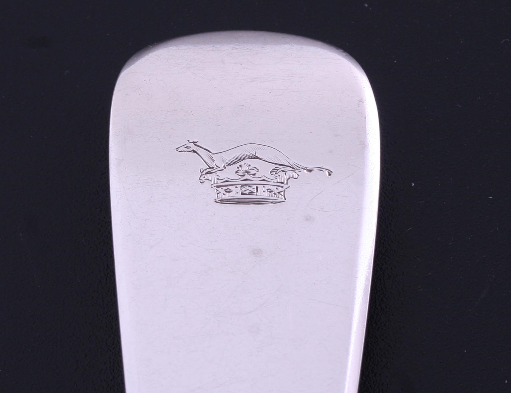 a Victorian fiddle pattern silver table spoon, engraved obverse with a family crest.