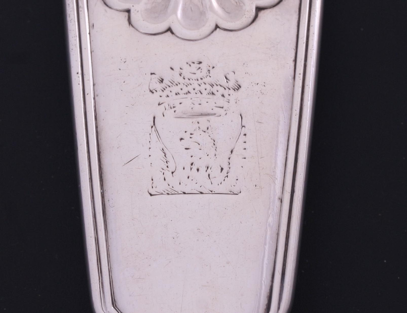 a George IV fiddle and thread pattern silver soup ladle, engraved with a family crest surmounted by a viscount's coronet
